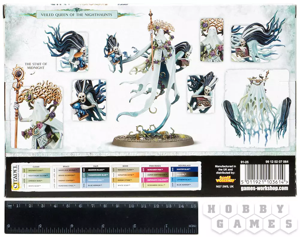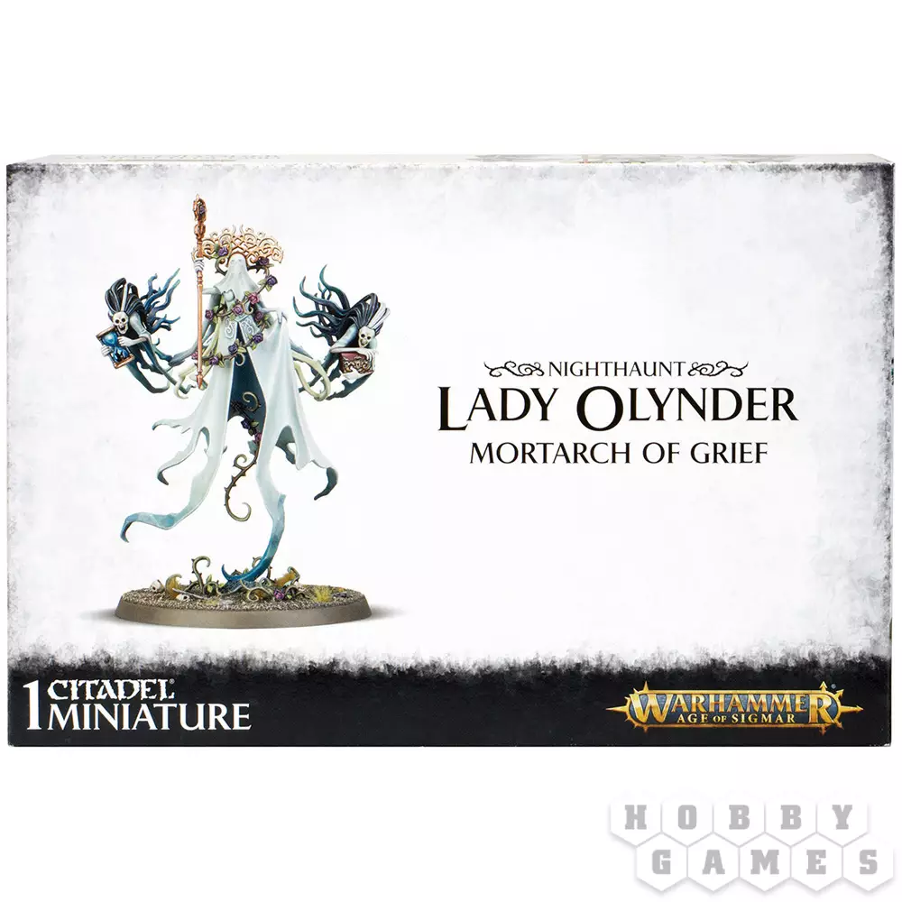 Этот многокомпонентный пластиковый набор содержит детали, необходимые для сборки миниатюры Леди Олиндер, Мортарха Печали (Lady Olynder, Mortarch of Grief). Окруженная аурой абсолютного несчастья и опустошенности, она парит над землей в своем призрачном подвенечном платье и фате, и только очертания черепа проглядывают сквозь ткань. Её свадебный наряд рассыпается на части и спадает позади неё рваными кусками, часть призрачного одеяния служит креплением миниатюры к базе. Тернистые лозы могильных роз произрастают везде, где проплывает призрачная фигура Леди Олиндер, обвиваясь вокруг неё к головному убору, напоминающему терни шиповника. В её правой руке находится Посох Полуночи (Staff of Midnight), резной шест, увенчанный полированным драгоценным камнем из остекленевшего могильного песка. Её сопровождают две жуткие баньши-прислужницы, череполикие призраки со свадебными подарками в руках – песочными часами, дарованными самим Нагашем, которые принесут смерть, если их расколоть, и запечатанной шкатулкой, содержание которой является жуткой и печальной тайной.