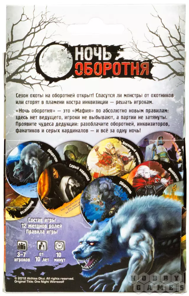 Настольная игра "Ночь оборотня" – это разговорная психологическая игра по мотивам популярной и всемирно известной "Мафии". На этот раз мы будем делиться на оборотней и инквизицию и, посредством диалогов, выяснять, кто же из нас более скрытный, коварный и хитрый. Но, если для игры в "Мафию" нужна большая компания игроков и хотя бы 30 минут на одну партию, то для партии в "Ночь оборотня" достаточно от 3 до 7 игроков и около 10 минут свободного времени! Партии динамичны и скоротечны, ведь в эти суровые времена кому-то точно придётся оказаться на костре. И как можно скорее…