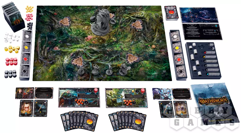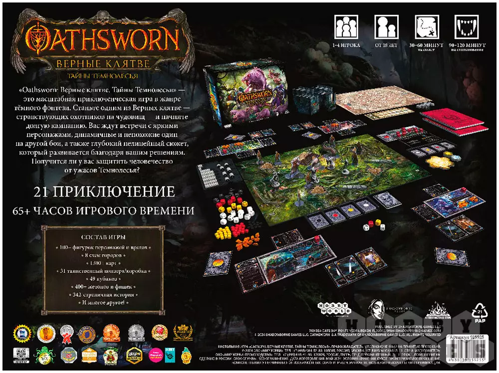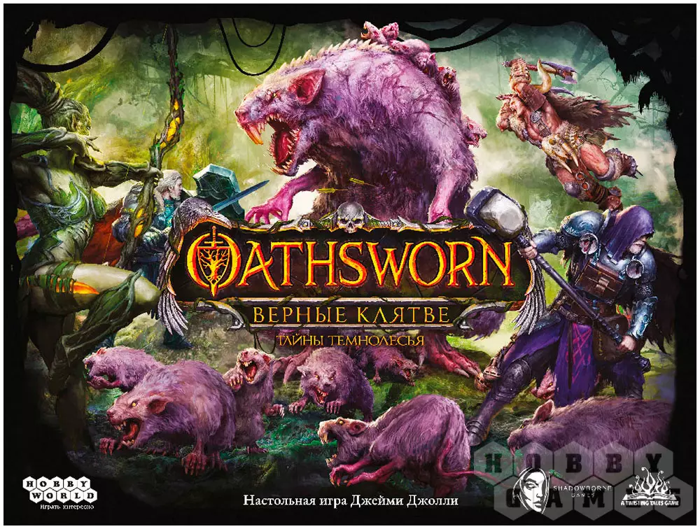 "Oathsworn: Верные клятве. Тайны Темнолесья" – это интерактивная настольная игра в жанре тёмного фэнтези. Вы станете вольнонаёмниками, которые отправятся в путешествие по когда-то великим землям, теперь поглощённым разрушительным Темнолесьем. Вы будете сражаться с врагами, сидеть над головоломками и взаимодействовать с таинственными предметами из реального мира. "Тайны Темнолесья" – это кампания, объединённая серией приключений, каждое из которых состоит из двух частей. Решения, которые вы будете принимать на своём пути, непосредственно влияют на исход ваших странствий. Динамичные бои, нелинейный сюжет, прописанный мир и уйма приключений – всё это и есть "Oathsworn: Верные клятве. Тайны Темнолесья".
