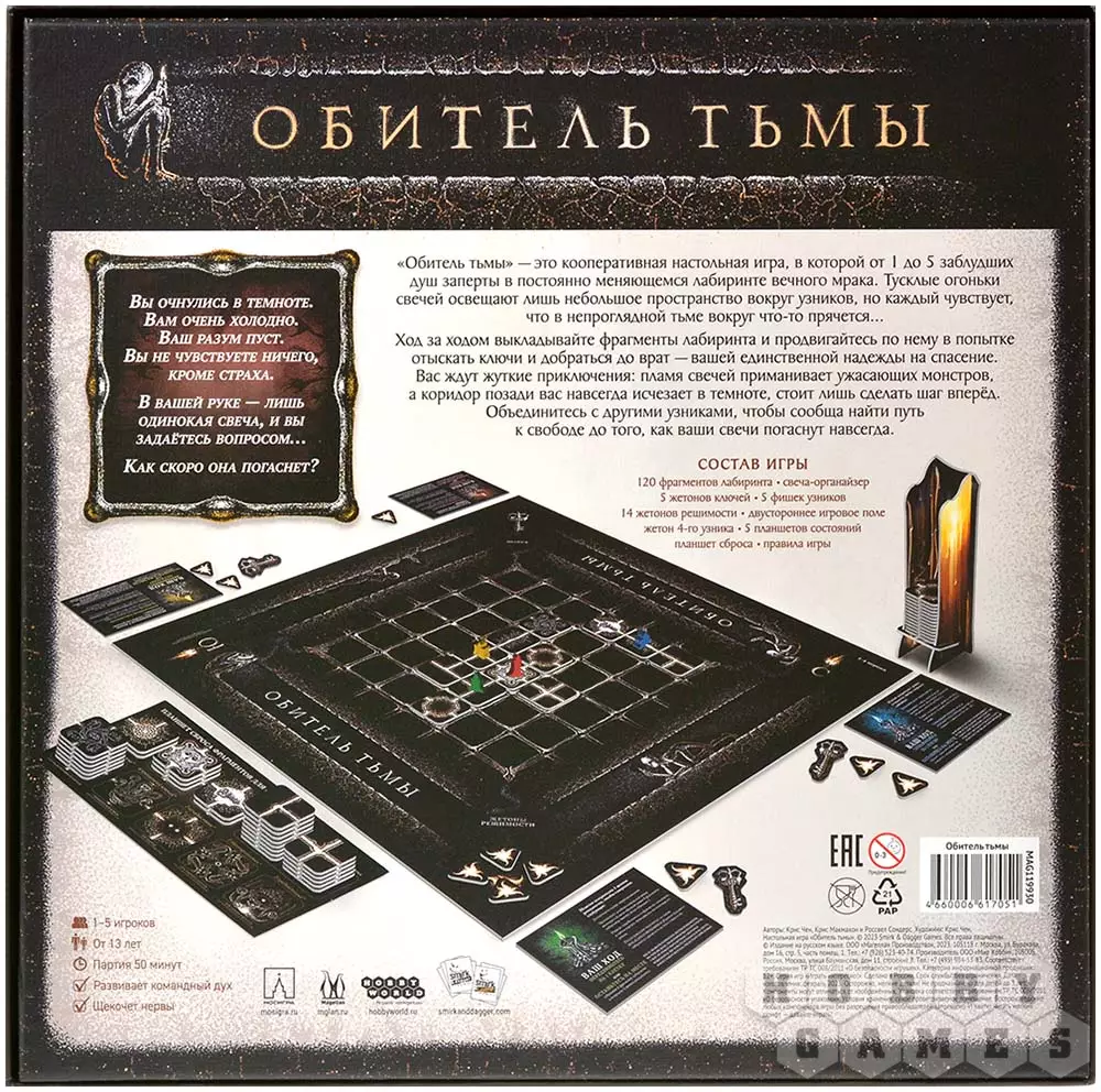 "Обитель тьмы" – это кооперативная настольная игра, в которой ваша задача – выбраться из мрачного лабиринта. Освещая путь, вы будете обнаруживать новые проходы, а старые, расплывшись во тьме, будут исчезать навсегда. Чтобы покинуть это жуткое место, придётся кооперироваться и планировать действия – в противном случае вас поглотит тьма. Всего в "Обитель тьмы" могут играть до пяти игроков – но вы также можете бросить вызов страху и в одиночку в соло-режиме.