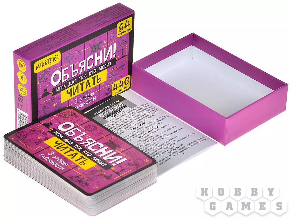 В коробке вас ждут 64 карточки, на которых собраны слова, разделённые на три уровня сложности. Здесь есть всё, чтобы проверить свою литературную эрудицию: важнейшие термины из области литературоведения и лингвистики, названия культовых произведений и фамилии писателей, вошедших в историю.