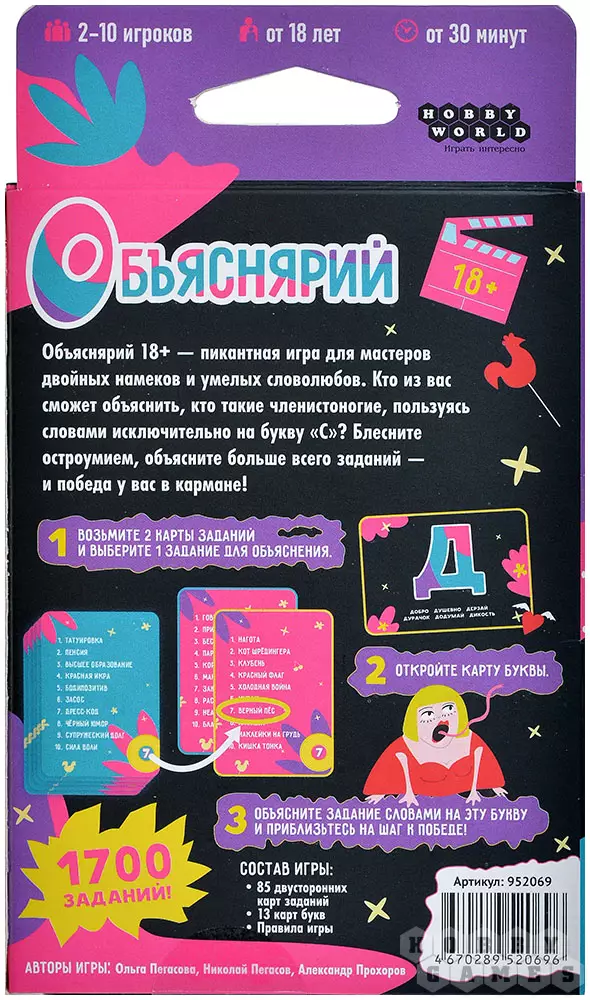 В версии для взрослых вас ждут слова на "взрослые" темы, различный сленг, а также отсылки к мемам. Все задания абсолютно новые, а это значит, что эту игру можно смело смешивать с классическим "Объяснярием".