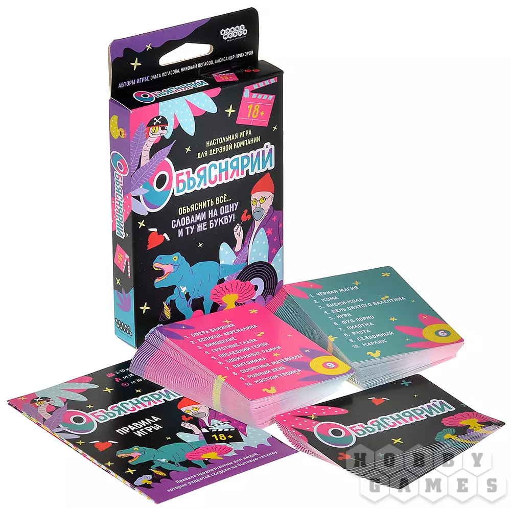 "Объяснярий 18+" – это пикантная карточная игра, которая заставит ваш мозг выложиться не на 100, а на все 200 процентов! Задача игроков предельно проста – всего лишь объяснять слова другими словами. Вот только делать это придётся не абы как: словарь игроков будет ограничен до одной единственной буквы. С этой игрой вы точно освежите и пополните ваш словарный запас.