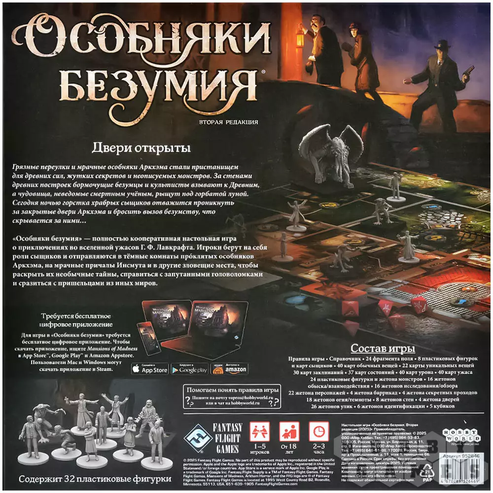 Обратите внимание! Требуется бесплатное цифровое приложение! Для игры в "Особняки безумия" требуется бесплатное цифровое приложение. Чтобы скачать приложение, ищите Mansions of Madness в App Store™, Google Play™ и Amazon Appstore. Пользователи Mac и Windows могут скачать приложение в Steam.