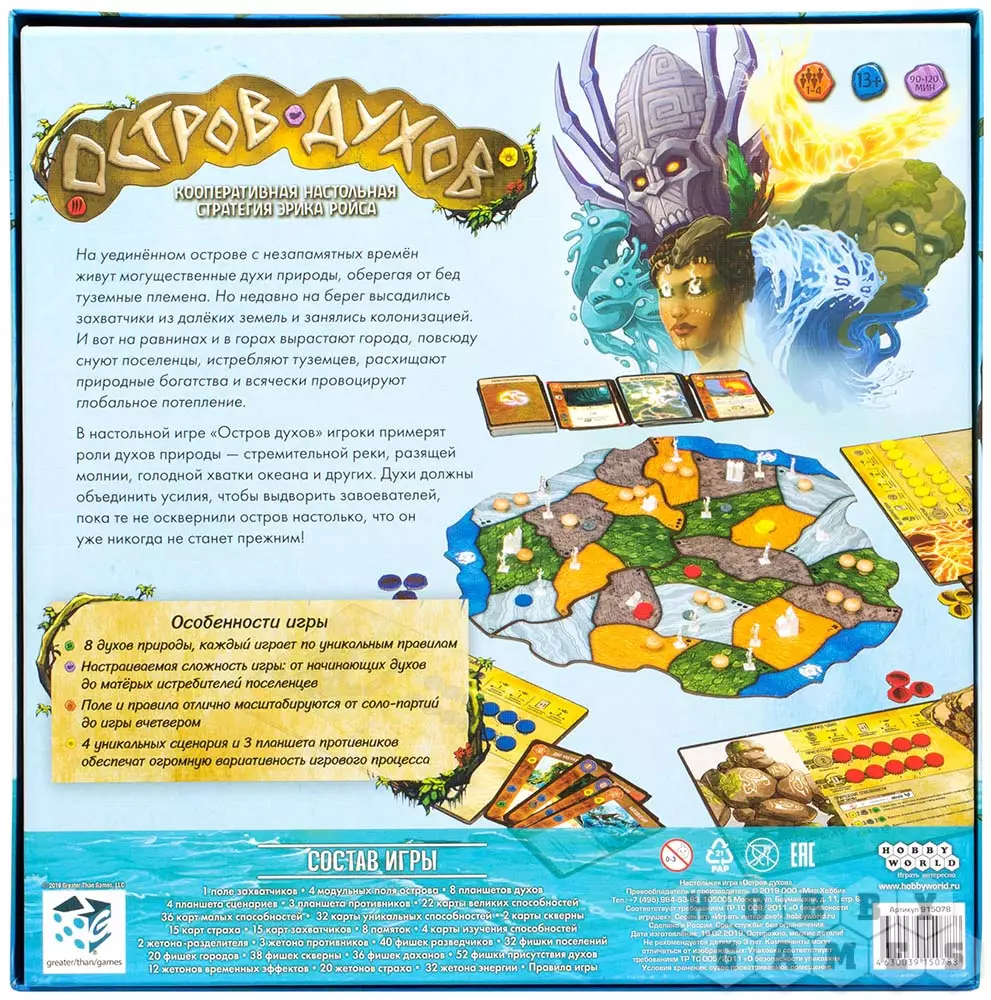 "Остров духов" – это захватывающее кооперативное приключение, погружающее игроков в сказочный мир цветущего острова. Каждый игрок берёт на себя роль одного из духов, которые отвечают за определённые силы природы. Ваша общая задача на игру – разобраться с незваными колонизаторами. Вам предстоит использовать свои уникальные способности, укреплять остров и помогать даханам. При этом в начале игры духи не очень сильны, полную мощь вы наберёте по ходу партии.