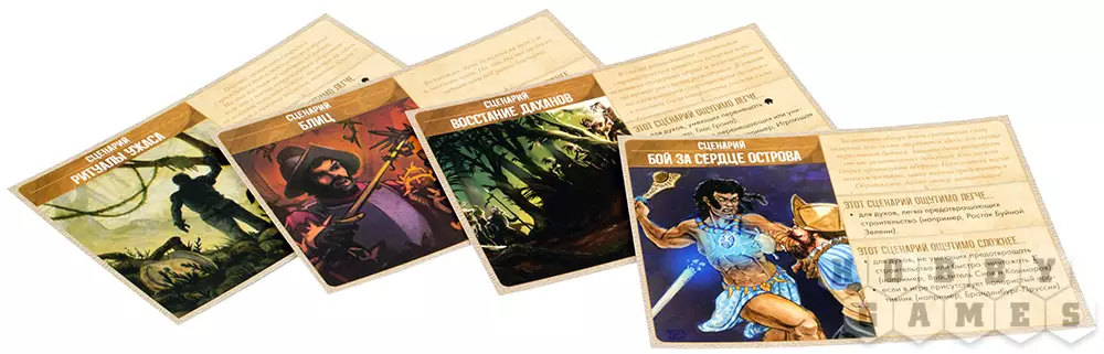 Для начала каждый игрок выбирает себе подходящего духа. Каждый дух отличается уровнем сложности и уникальными способностями. Игроки формируют карту острова, поделённую на секторы. На них и будет проходить партия.