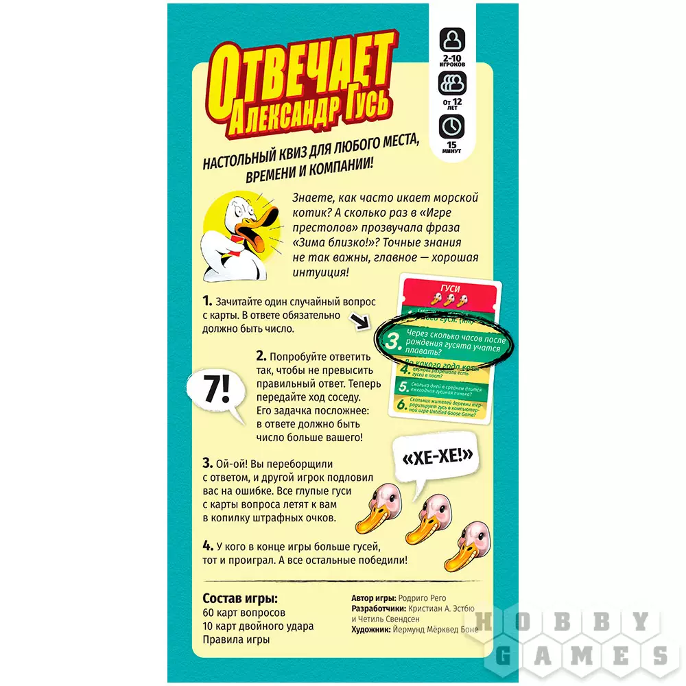 "Отвечает Александр Гусь" – это весёлая игра для большой компании. Игрокам предстоит угадать правильный ответ на заковыристый вопрос, ну, или, по крайней мере, попытаться максимально близко приблизиться к нему. В то же время придётся следить за ответами остальных участников и в нужный момент проверить их.