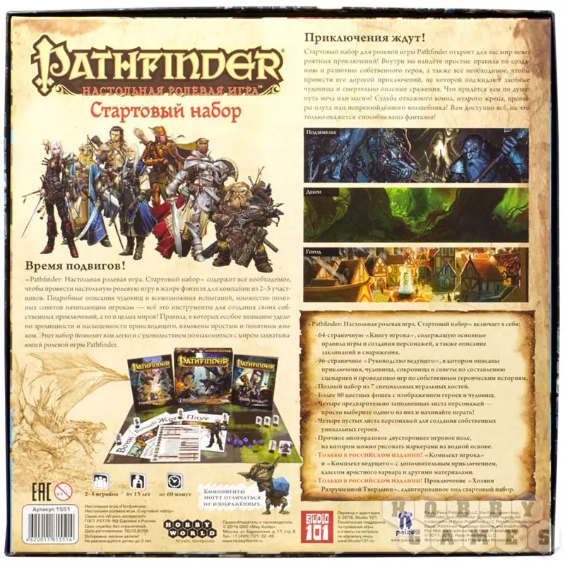 Рустем12.03.2021 21:09Знаете, уже давно хотелось поиграть в Dungeons&Dragons, но до недавнего времени проблемно было что-то подобное достать в родном городе. И вот мне на глаза попадается Pathfinder - немного пообщавшись с продавцом и погуглив, решил брать - и не ошибся: пусть вас не смущает надпись "Стартовый набор" - в этой плотной коробке найдется все, чтобы плавно войти в мир Фэнтези и приключений, а завершив приготовленный сценарий, вполне можно создать свой - главное чуточку фантазии и чтобы кто-то решил взять на себя роль Мастера :). По поводу качества - здесь нет пластиковых фигурок, только картонки, устанавливаемые в подставки, но для меня это скорее плюс - красочные арты интереснее белесых однотонных пешек (хотя, если вы творческий человек и любите красить модели, это может быть минусом), бестиарий достаточно разнообразный, а набор правил и механик, изложенный в иллюстрированных книгах даже просто читать интересно. В комплекте идет двухсторонняя карта для сценария и случайных боевых встреч (либо запланированных, так как позволяет рисовать на себе местность водным маркером). Если никогда не играли ролевые игры наподобие DnD, но хотите начать - сегодня этот набор будет очень кстати. -