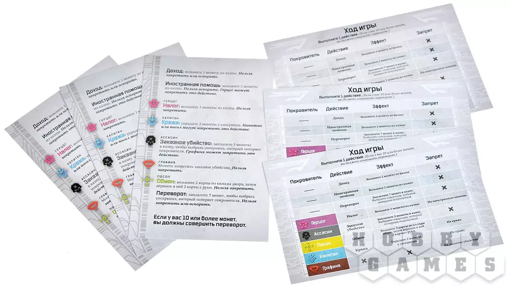Это игра на блеф с помощью карт. У вас будут карты покровителей, которые и позволяют вам выполнять те или иные действия – или запрещать их. Если вы лишитесь всех своих благодетелей, вы тут же проиграете, так что будьте осторожны. Действия в основном связаны с добором монет или их тратой, направленной на то, чтобы попытаться вывести с политической арены своего соперника.