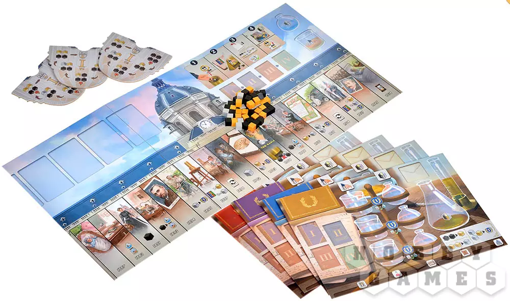 Заключительная стадия – отдых. Просто проверьте, не превышен ли лимит хранения кубиков в колбе, и сбросьте лишние. Затем продвиньте маркер университета на одну ячейку вперёд, тем самым подготавливая игру к следующему ходу.