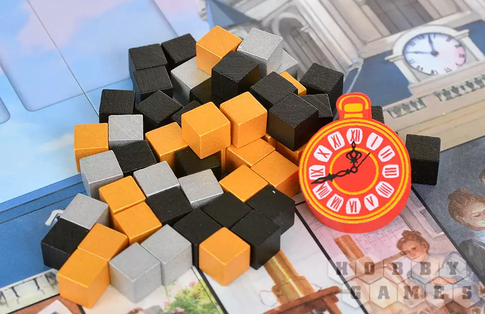 Ваше путешествие начинается с университета – для этого проверьте маркер на соответствующем треке. Если он стоит на ячейке с часами, продвиньте его вперёд, получите указанные на новой ячейке ресурсы и сбросьте их в башню, чтобы узнать, какие из них вам выпадут.