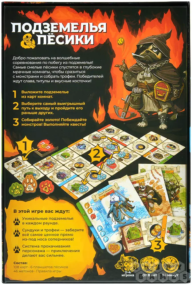 "Подземелья и пёсики" – это весёлое фэнтезийное приключение, в котором необычные пёсики имеют различные классы, прямо как в настольной ролевой игре. Вашей задачей будет выйти из подземелья, побеждая по пути разных монстров, выполняя квесты и собирая трофеи. Но это не командное приключение, вы будете соревноваться с другими игроками в скорости. Подземелье собирается из случайных карт, поэтому каждую игру у вас будет абсолютно уникальный маршрут! Ну и какое фэнтези без прокачки героев? Это в игре тоже присутствует. Хвост пистолетом, друзья! Проявите всю остроту вашего нюха и найдите самый оптимальный выход!