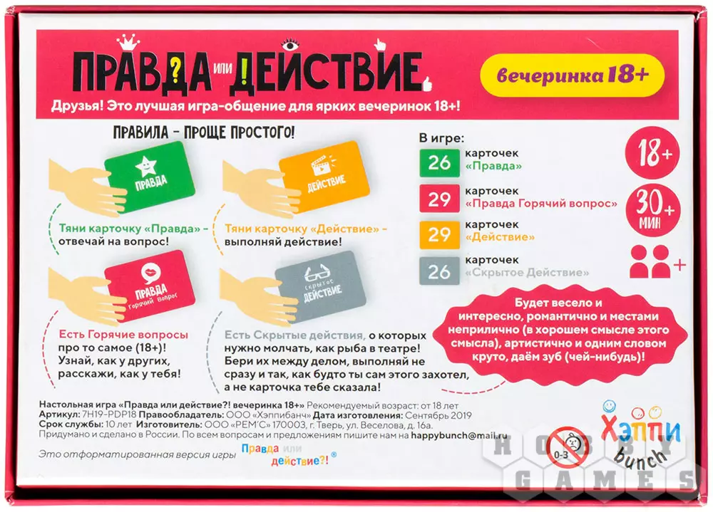Ничто так не сближает компанию на вечеринке, как весёлая и непринуждённая атмосфера игры! Но что, если в кураже общения разговор зайдёт о почти запретных темах? Не спасовать в подобной ситуации вам поможет новое издание легендарной игры "Правда или действие. Вечеринка 18+": каждому участнику предстоит выйти за пределы своей зоны комфорта, чтобы без страха говорить о том, что интересно, романтично и местами неприлично (в хорошем смысле).