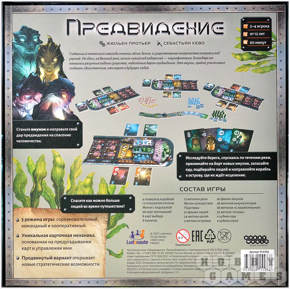 В настольной игре "Предвидение" вы станете имунами – существами, способными видеть будущее. И вы действительно сможете предвидеть грядущие события благодаря системе двойного выбора. Ваши видения – это карты экспедиции, которые вы получаете и отдаёте другим игрокам: часть карт вы оставляете себе, часть отдаёте игроку слева, часть – игроку справа. Одна из карт обязательно вернётся к вам в следующем раунде, поэтому вы будете знать заранее, от каких действий строить свой следующий ход. Только тот игрок, кто грамотно трактовал свои видения, сможет достигнуть победы и спасти остаток человечества.
