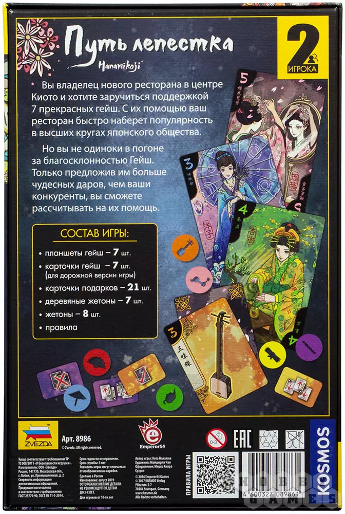 pax21.05.2021 22:28Отличная дуэльная игра. Очень простые правила, всего четыре действия за раунд на каждого игрока. Но каждый раунд эти четыре действия заставляют напрячь мозги. В коробке есть две версии карт гейш (карты и большие жетоны), версию с картами можно легко взять в дорогу. -