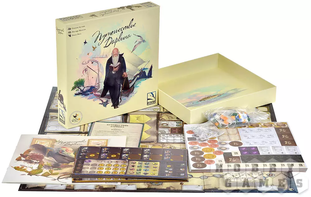 "Путешествие Дарвина" – стратегическая настольная игра для 1-4 участников, в которой вы управляете экспедицией, нанимаете ассистентов, исследуете регионы, собираете редкие образцы и создаёте научные труды. Механика построена на евро-принципах: менеджмент ресурсов, планирование действий и развитие собственной лаборатории. Ассистенты – зоологи, ботаники и другие специалисты – помогают вам открывать новые виды и продвигаться по следу Дарвина. Каждый ваш шаг приближает к победе, но и соперники не дремлют. Пути к успеху разнообразны – выбирайте стратегию, развивайте теории и наблюдайте, как маленькие детали складываются в великое открытие.