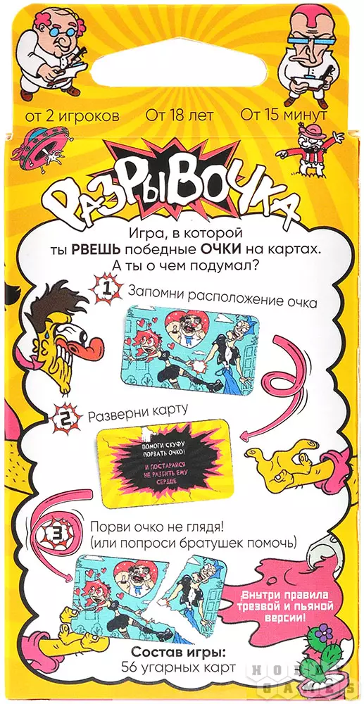 Ваша задача – по очереди брать смешные карточки из общей колоды, смотреть на них (напоминаем, что больше такой возможности не представится!), запоминать расположение очка, а затем безжалостно рвать! Но не абы как, а в соответствии с заданием, написанным на обратной их стороне, – так называемым "нюансом". Очко (такое белое облачко, похожее на взрыв) при этом обязательно должно быть разорвано, ведь в этом суть всей игры! Загвоздка в том, что делать это предстоит вслепую, пытаясь вспомнить все детали красочной картинки, которую вы до этого рассматривали. А под влиянием горячительного сделать это порой не так-то и просто. А уж если очко на карточке не одно...