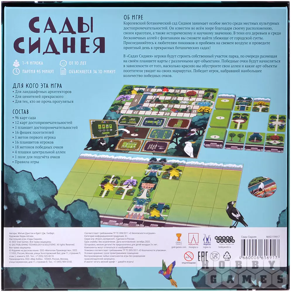 "Сады Сиднея" – несложная в освоении настольная игра, в которой вы будете заниматься планировкой парка. Каждый игрок строит собственный участок парка, исходя из того, чтобы создать наиболее интересный и богатый на впечатления туристический маршрут. "Сады Сиднея" радуют прекрасной и непринуждённой атмосферой: яркие иллюстрации отлично дополняют изящный игровой процесс.