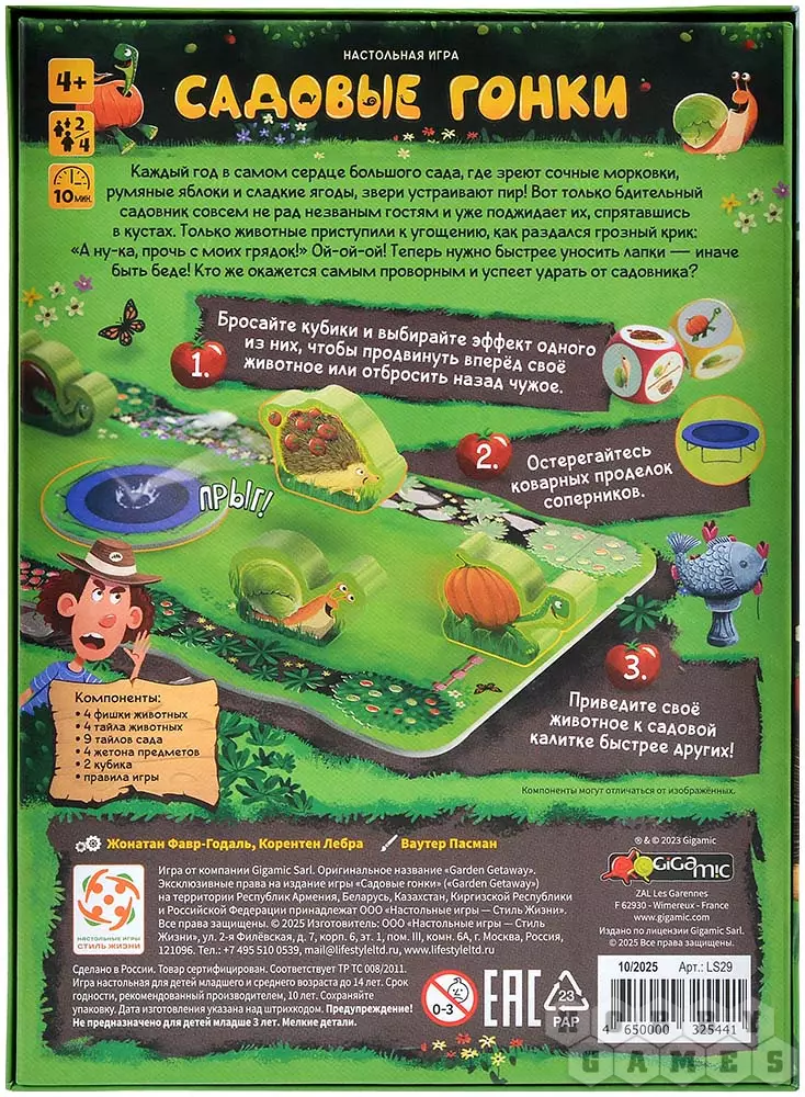"Садовые гонки" – яркая и динамичная настольная игра для всей семьи, где вам предстоит возглавить побег весёлой звериной компании из сада. Ваша цель – первым привести своего подопечного к спасительной калитке, пока сердитый хозяин не поймал нарушителей. Всё очень просто и весело! Вашими помощниками станут два волшебных кубика с картинками зверушек. Бросьте их и выберите свою тактику на этот ход: помочь своему зверьку сделать шаг к свободе или отбросить назад самого опасного конкурента!