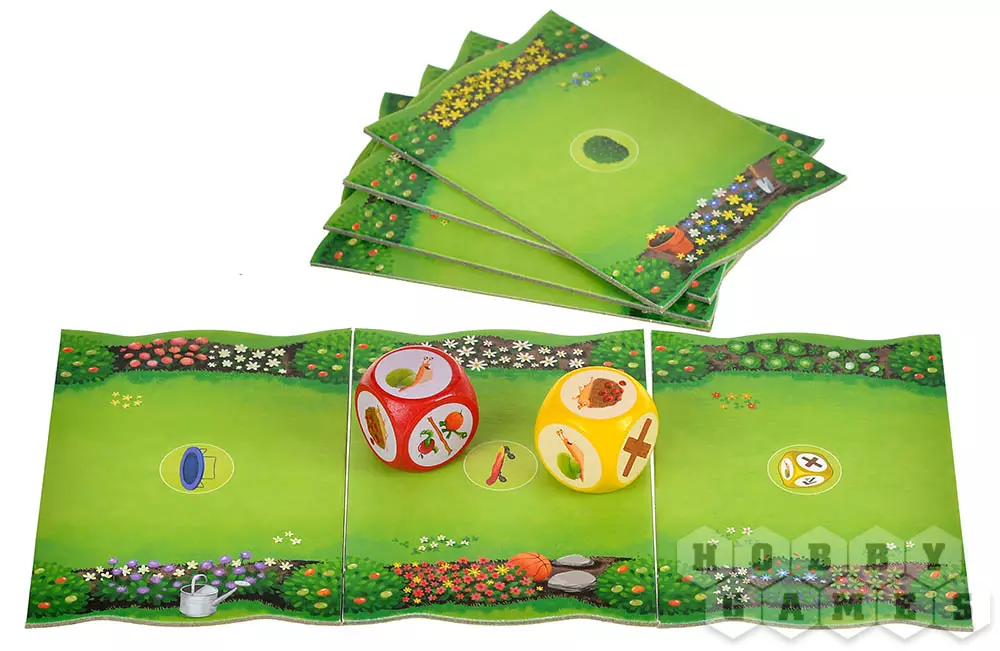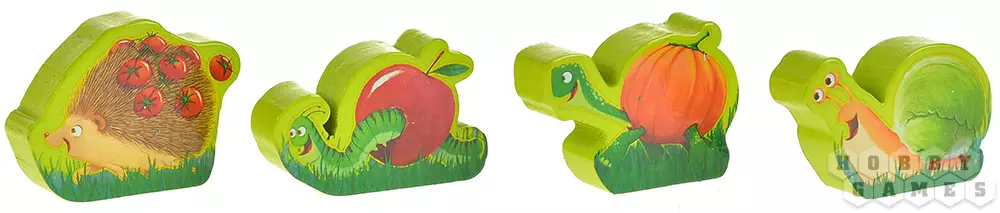 Сначала вы создаёте гоночную трассу! Вы выкладываете в ряд волшебные плитки сада, а в конце ставите калитку – это финиш. Каждый из вас тайно выбирает себе одного любимого зверька (черепаху, ёжика, улитку или гусеницу), за которого будете болеть. Все четыре фигурки ставятся на старт. Готово? Тогда вперёд, к побегу!