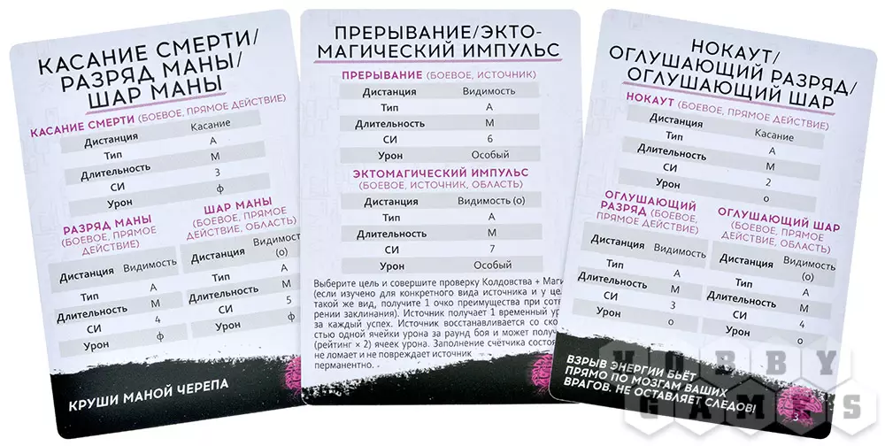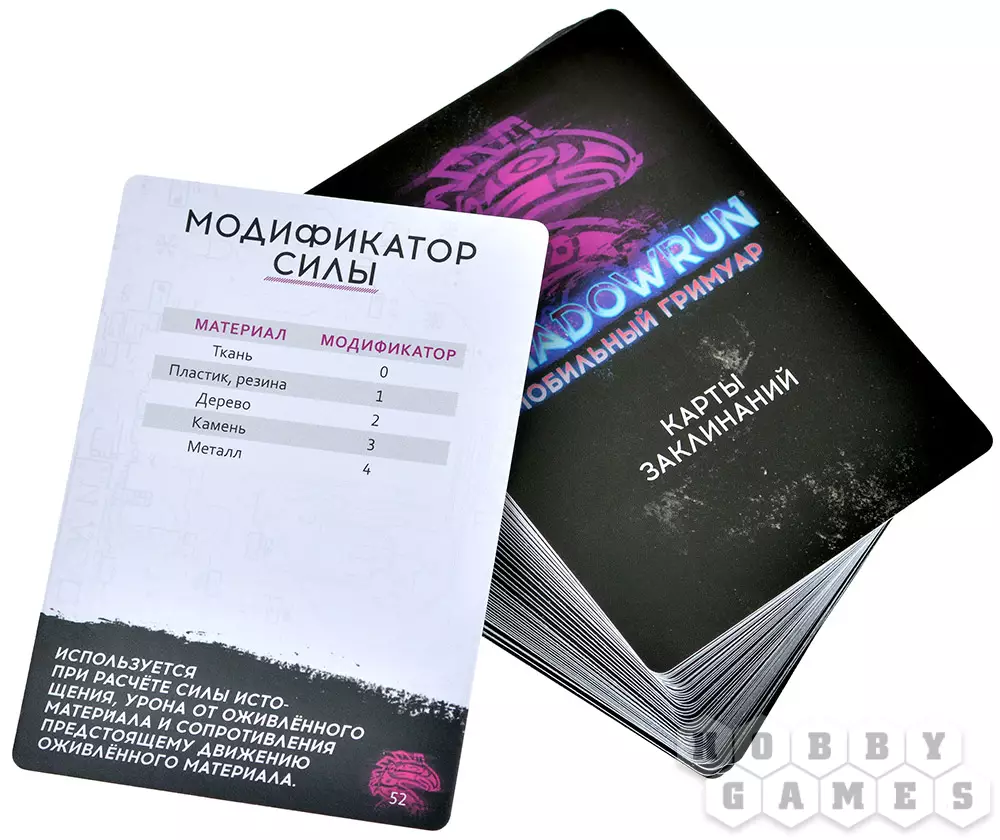 Данный набор содержит 52 карты различных заклинаний, включая как боевые, так и заклинания иллюзии, исцеления, обнаружения и управления. На картах вы найдёте полезную информацию, что позволит всегда быть готовым к потасовке: тип и дистанцию заклинания, его особенности и прочее. Удобно использовать в ходе партии как игрокам, так и мастеру!
