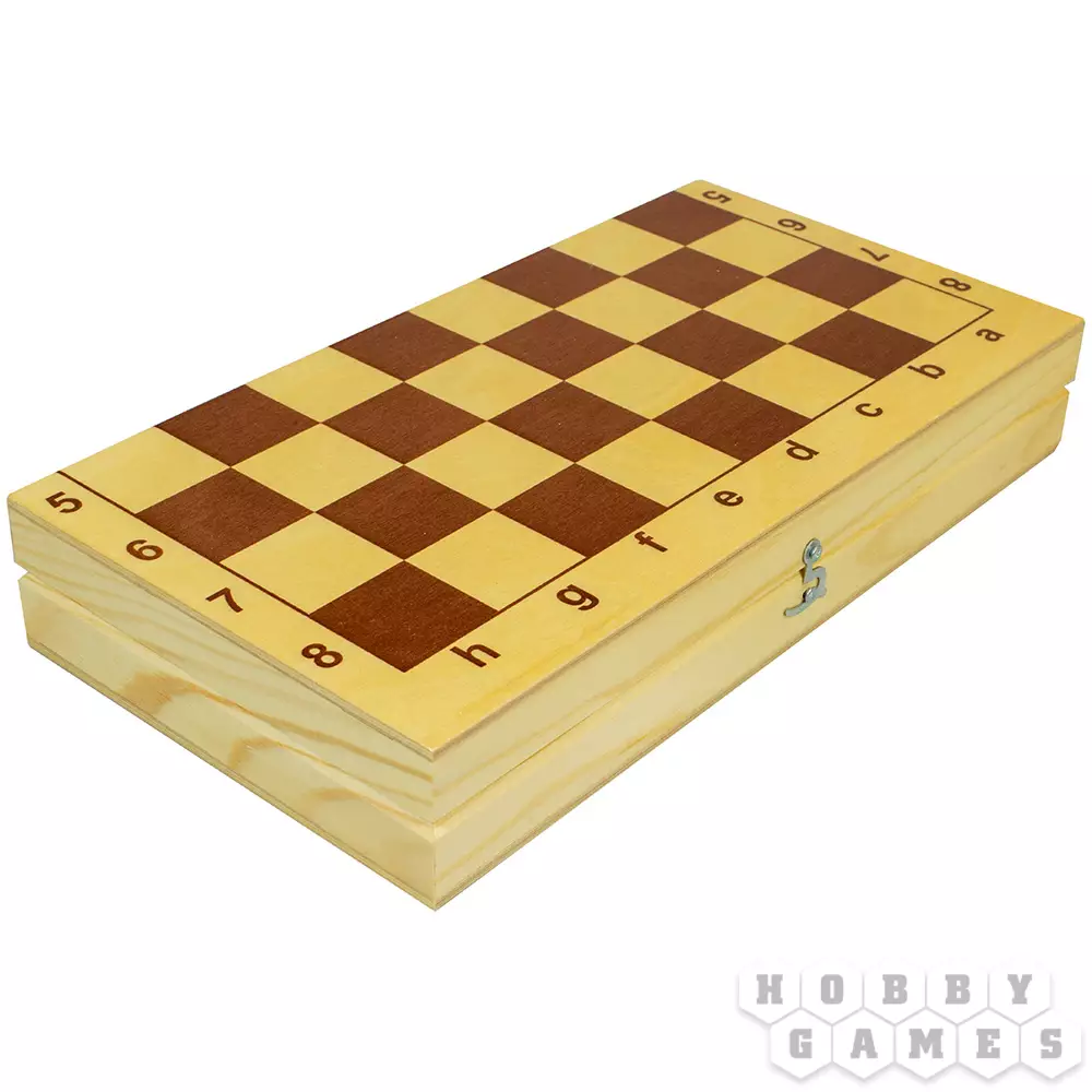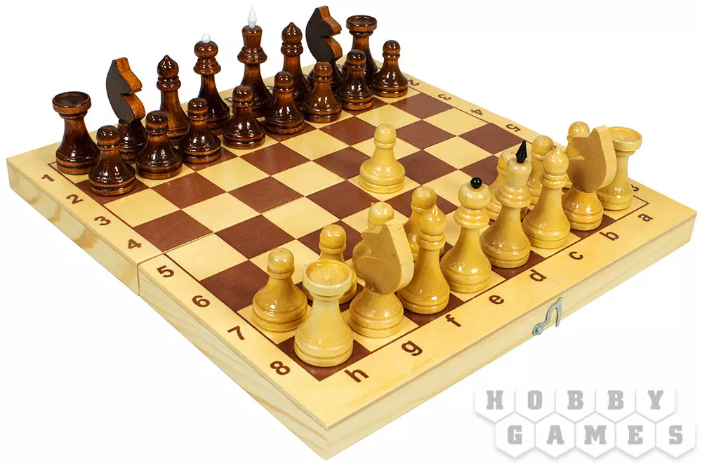 Доска и фигуры сделаны из дерева и покрыты лаком.