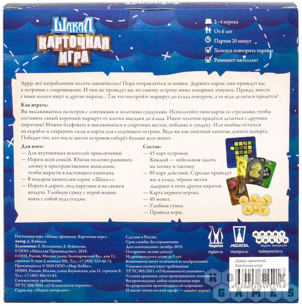 Высадившись на один из островов, вам понадобится составить из своих карт наиболее короткий маршрут до заветного сундука. Чтобы не пришлось делиться с другими пиратами, вы можете блефовать, высаживаться в секретных местах, а также вообще оставаться на корабле, приберегая силы для следующего, более насыщенного золотом острова. Самое главное – быть главным богачом по итогам исследования шести островов. Победы достигают лишь самые смекалистые юнги, неутомимые искатели приключений и истинные ценители серии игр "Шакал".