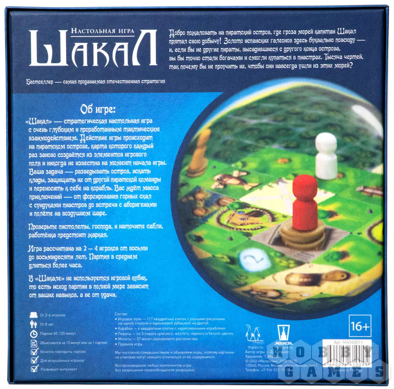 Это настольная стратегия, основанная на оригинальной игровой механике. Главный секрет «Шакала» кроется в том, что фишки на игровом поле размещаются в произвольном порядке. Благодаря такой находке, игра каждый раз будет разной. В игре не используется кубик, а результат партии в основном зависит от стратегических и логических способностей участников. Так что на удачу надеяться не приходится. Возможное количество участников партии составляет 2-4 человека. Каждая партия длится порядка 1-2 часов.