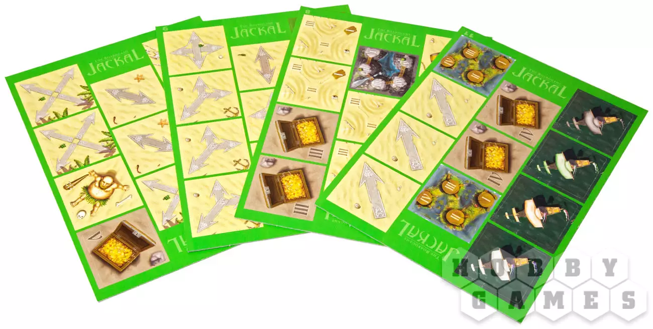 На острове сокрыто 16 кладов различной ценности. Если на только что перевернутой клетке нарисован сундук с сокровищами, выкладывайте на эту клетку столько монет, сколько на ней указано римской цифрой. Однако не стоит ликовать прежде времени. Золотишко станет вашим только тогда, когда оно будет погружено на ваш корабль. Монетку, перенесенную на борт корабля, с поля убираем в свою копилку.