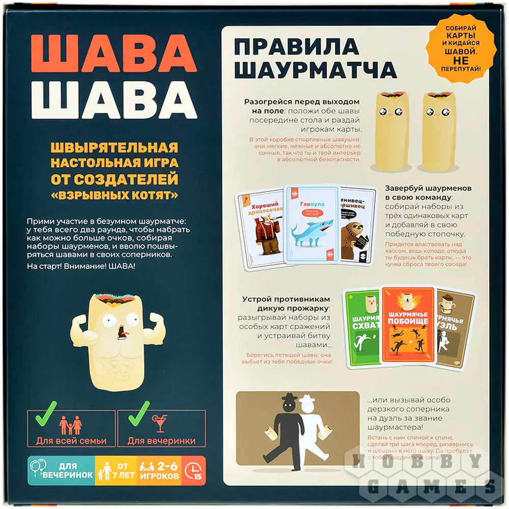 "Шава Шава" – это новая безумная настольная игра от авторов "Взрывных котят". В ней на протяжении двух раундов вам предстоит вербовать шаурменов, собирая наборы из трёх одинаковых карт – именно они будут приносить победные очки. Колода, откуда вам придётся тянуть карты, – это сброс игрока по соседству, поэтому не ждите хоть какого-то порядка в этом сумасшедшем хаосе! Игра бы не называлась "Шава Шава" будь в ней только карточки: в центре стола будут лежать 2 прекрасные мягкие шавы, которые только и ждут розыгрыша особых карт, чтобы полететь кому-нибудь в личико... Они в самом деле мягкие и ничего не пачкают, так что не нанесут вреда ни вам, ни вашей мебели (но лучше всё-таки не целиться в голову).