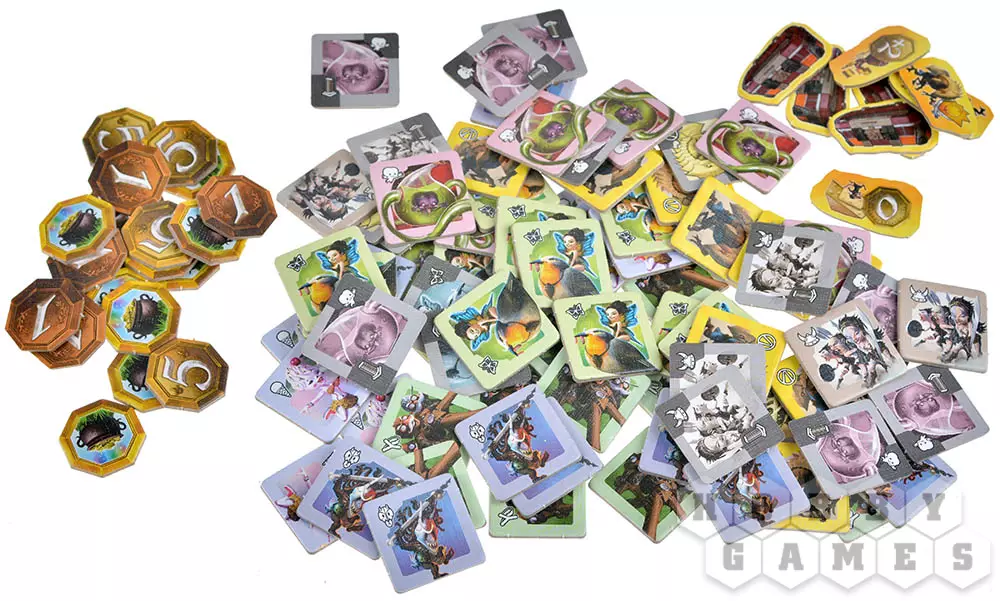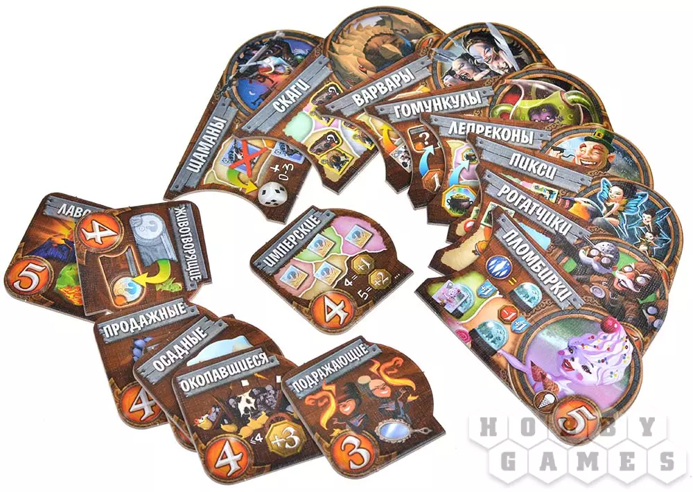 Рядом с картой случайным образом располагаются стартовые народы и уже к ним добавляются различные способности. Как вы понимаете, вариаций здесь может быть огромное количество, от Болотных Волшебников до Летучих Великанов, некоторые дают гибкость в стратегии, некоторые дополнительную мощь, а другие дополнительное золото. Помимо этого, у каждого народа своя численность, то есть разное количество жетонов, которыми вы сможете распоряжаться. Игрокам предстоит выбрать одну из комбинаций, именно с ней они и начнут свои военные подвиги. Вам предстоит максимально эффективно и выгодно использовать различные способности, чтобы получить больше монет.
