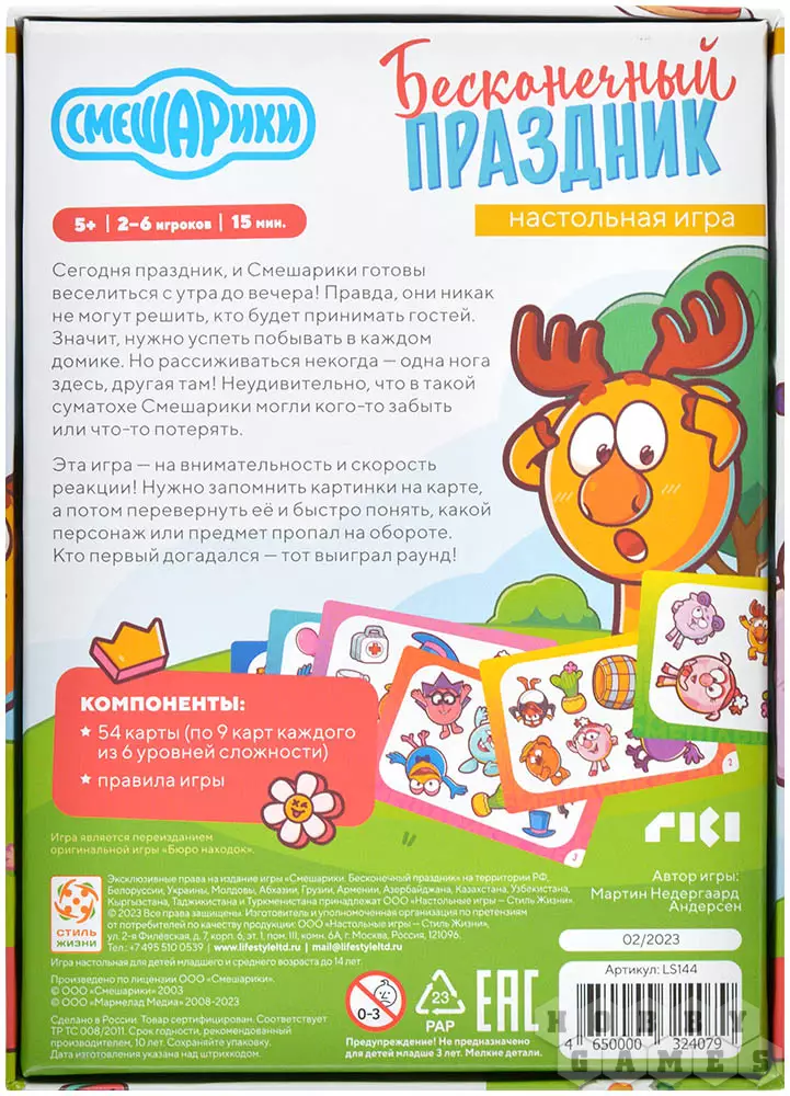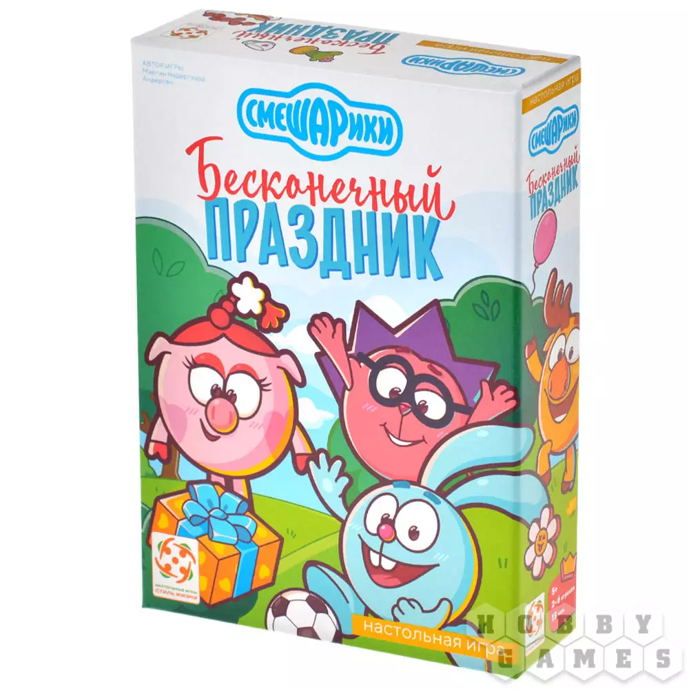 "Смешарики. Бесконечный праздник" – карточная мемори-игра на внимательность и скорость реакции. В центр стола выкладывается колода карт. Игроки внимательно смотрят на верхнюю карту, после чего она переворачивается. Теперь задача участников – как можно быстрее назвать предмет или персонажа, который пропал на обороте карты. В случае правильного ответа игрок получает эту карту в награду.