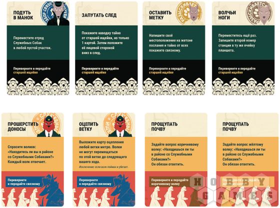 Ключевой элемент игры – карты маршрута, которые определяют три важнейшие точки на поле: стартовую станцию, где волки начинают игру; укромное место для оставления компромата; и выход из города для побега. Только связной знает все три точки, а волкам в начале игры открывается лишь стартовая позиция.