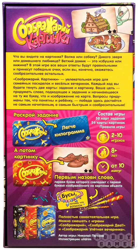 "Соображарий: Картинки!" – это продолжение серии увлекательных развивающих игр для всей семьи и для любого возраста. Сама по себе очень проста в освоении, динамична, подходит одновременно для детей и взрослых, отлично развивает логику, словарный запас, аналитическое мышление, реакцию и т. д. В неё можно играть практически везде, взять её с собой также не составит никакого труда.