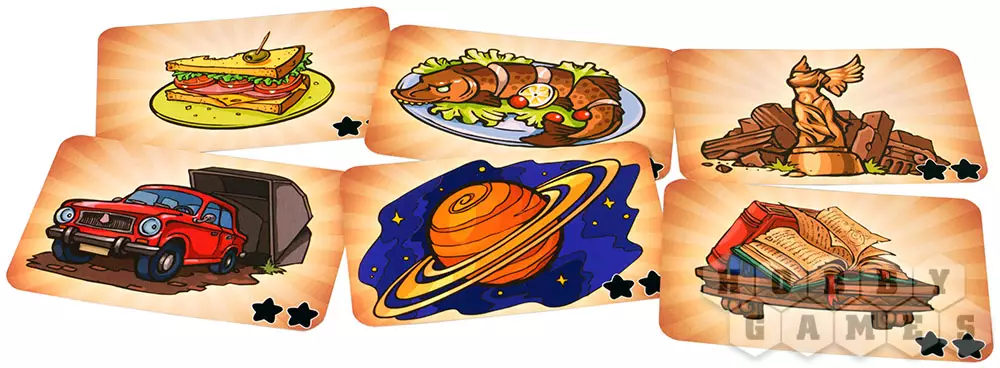 Каждый раунд начинается с того, что ведущий игрок раскрывает по одной карте из каждой колоды. И тут уже пора начинать соображать! Все игроки стараются как можно быстрее придумать слово, которое соответствует активной категории и начинается с буквы, подходящей под изображение.