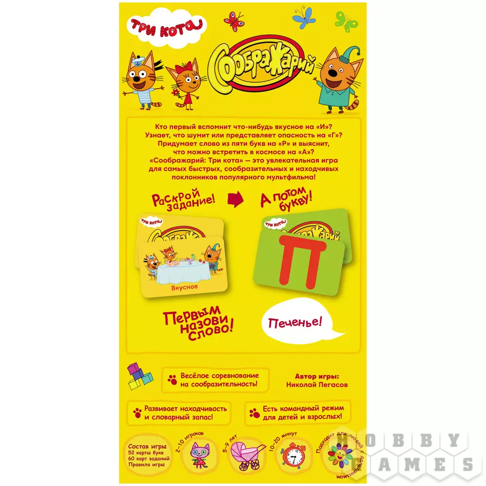 "Соображарий: Три кота" – это весёлая и занимательная игра для компании детей, которые, впрочем, не будут против, если к игре присоединятся и их родители. Придётся как можно быстрее вспоминать различные слова и называть их, да так, чтобы они подходили под определённые условия. Эта настолка придётся по вкусу не только поклонникам одноимённого мультфильма, но и всем-всем-всем!