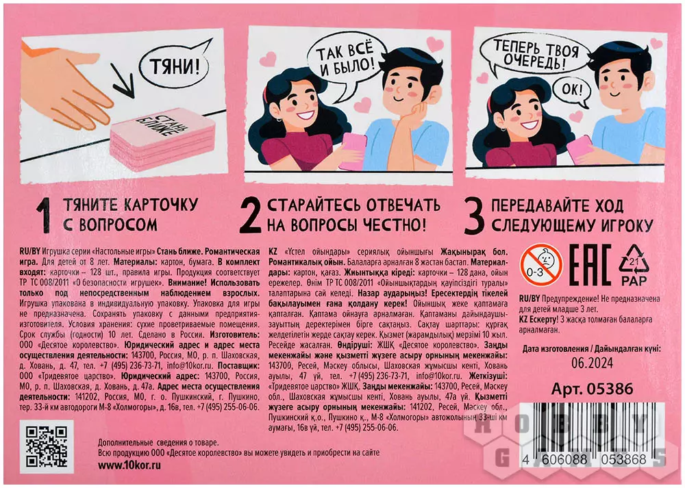 Серия простых карточных игр "Стань ближе", где невозможно победить или проиграть, поможет вам познакомиться поближе со своими соигроками. Просто возьмите карту из общей колоды, зачитайте вопрос и адресуйте его тому, кого выберете сами. Играйте до тех пор, пока не закончатся карточки или пока не устанете. Впрочем, если отвечать искренне и наслаждаться процессом, скучно не будет, а значит, и уставать будет не от чего!