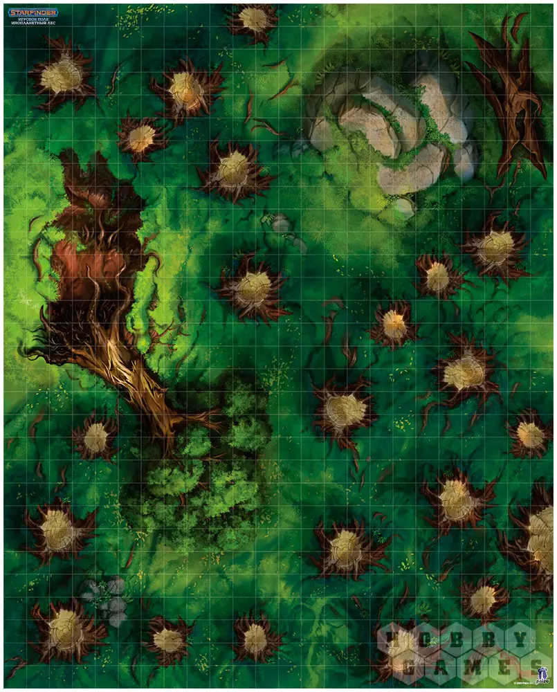 Данное двухстороннее игровое поле "Инопланетный лес" предусмотрено для игры в настольную ролевую игру Starfinder. Однако ничто и никто вам не запрещает использовать её вместе с другими игровыми системами! Одна сторона поля являет вам извилистые тропки, пролегающие сквозь густой лес, а другая – гигантские деревья величественной первобытной чащи.