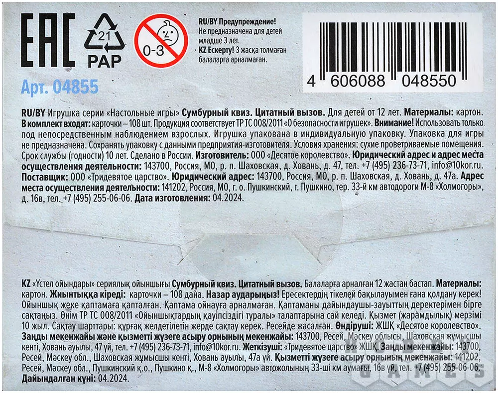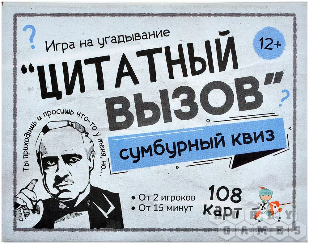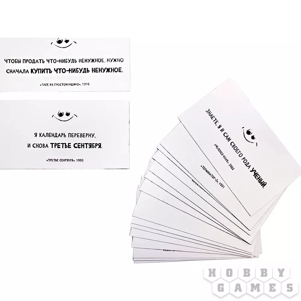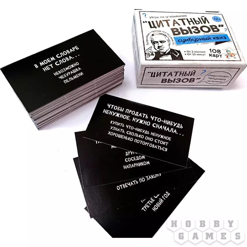 Как часто вы читаете книжки? А слушаете музыку? Смотрите классические фильмы? Если часто, ваш час настал: "Цитатный вызов" брошен вам не зря. Вы будете по очереди тянуть карточки, на каждой из которых написана цитата и приведены три варианта е продолжения. Ваша задача – выбрать верный ответ. Проверить себя просто: переверните карту и огласите написанное на обороте. Если вы угадали, заберите её себе. Настоящим эрудитом станет тот, кто к концу приобретёт самую толстую колоду с честно отгаданными вопросами! А самое приятное, побороться за это звание можно как вдвоём с другом, так и в большой компании!