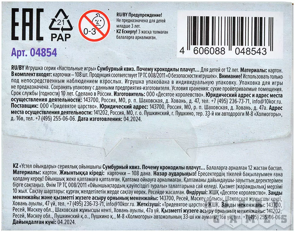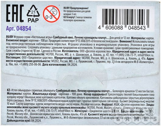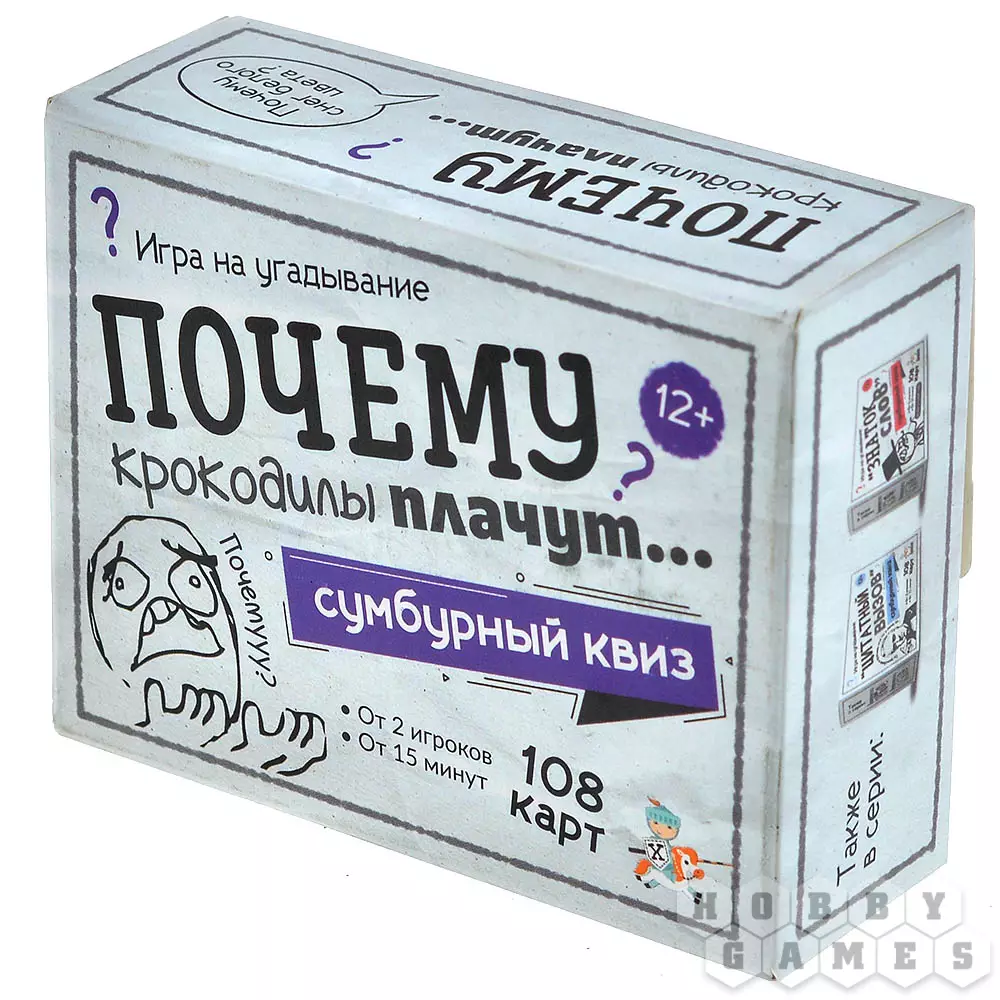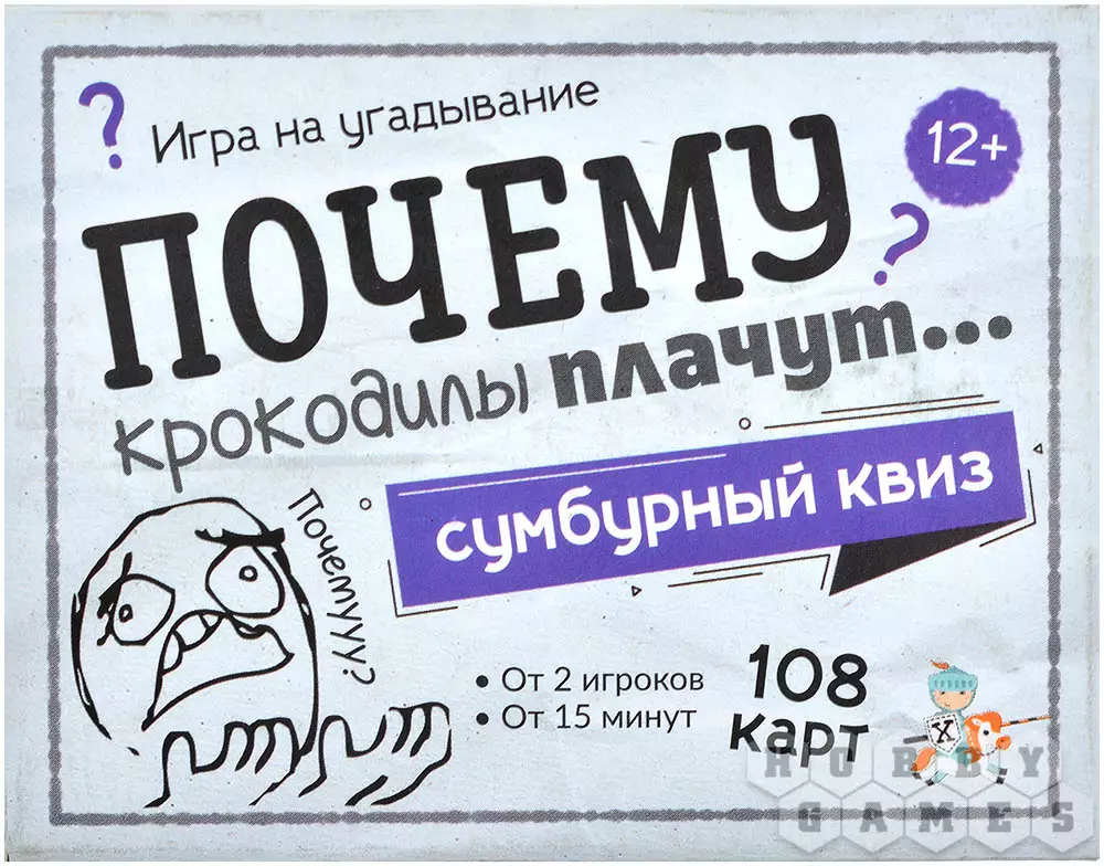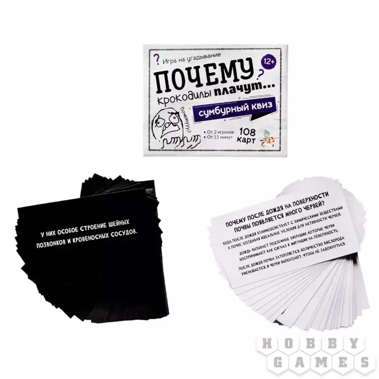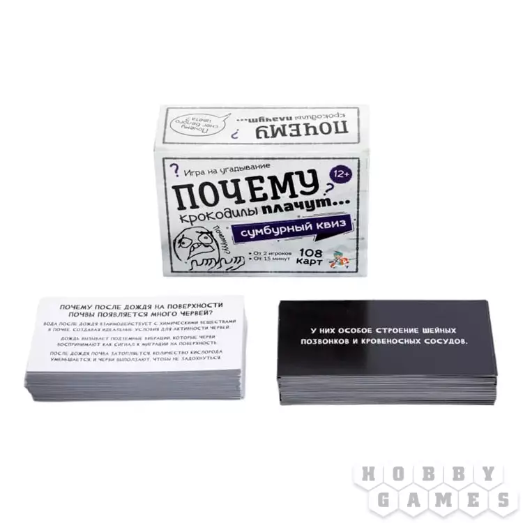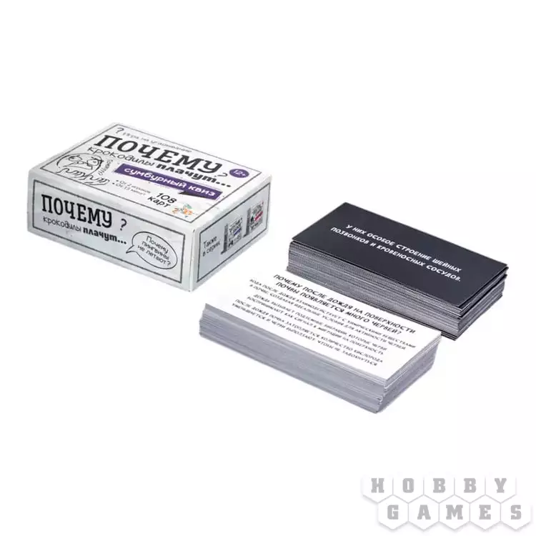 "Почему крокодилы плачут?" – спросите вы. И ответите тоже вы, ведь в этом и заключается смысл этой развивающей игры! Вы будете по очереди тянуть карточки, на каждой из которых написан вопрос и приведены три варианта объяснения. Ваша задача – выбрать верный ответ. Проверить себя просто: переверните карту и огласите написанное на обороте. Если вы угадали, заберите её себе. Настоящим эрудитом станет тот, кто к концу приобретёт самую толстую колоду с честно отгаданными вопросами! А самое приятное, побороться за это звание можно как вдвоём с другом, так и в большой компании!