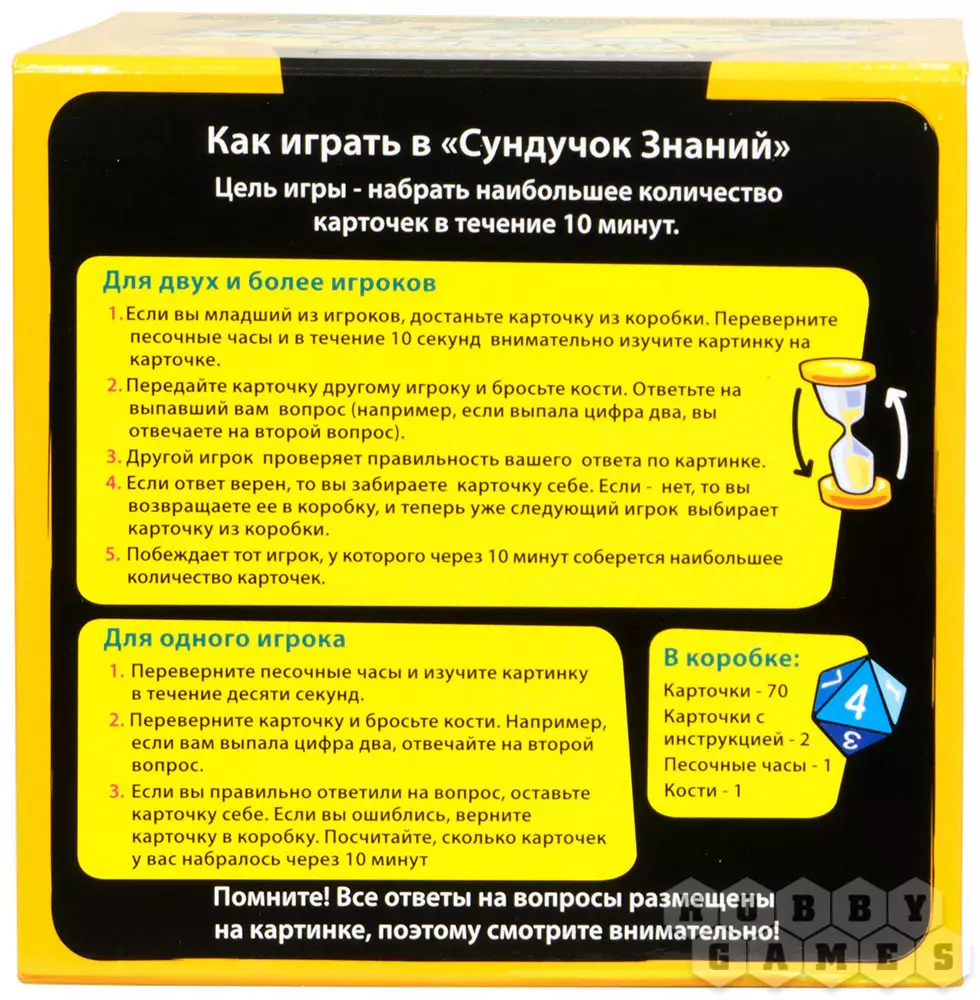 Серия настольных игр "Сундучок знаний" рассчитана на обучение детей в весёлой игровой форме. Эти игры развивают внимательность и наблюдательность, предлагая участникам изучить картинку в течение десяти секунд, а потом ответить на определённый вопрос. Каждая коробочка с игрой содержит несколько десятков карточек, объединённых одной тематикой. Таким образом, ребёнок, изучая карточки, усваивает полезную информацию по тому или иному предмету и узнаёт много нового и интересного.