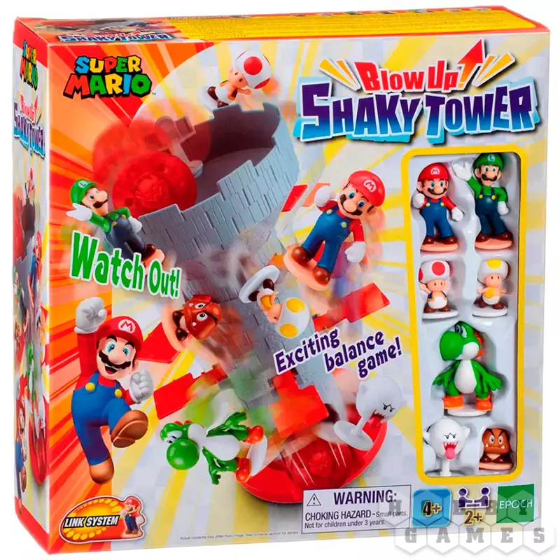 Встречайте любимых персонажей Super Mario в новой игре Blow Up! Shaky Tower! Это удивительно простая и интересная игра отлично подойдёт для детской вечеринки или для вечера в кругу семьи. Чтобы победить, вам предстоит разместить на вершине башни красную сферу. Однако это не так-то просто сделать! Вам также придётся расставлять фигурки персонажей на платформах башни в соответствии с выпавшим числом на кубике. При этом башня должна сохранять равновесие! Однако она невозможно шаткая и, кажется, вот-вот рухнет. Этого ни в коем случае нельзя допустить, иначе всё пропало. Игра станет удачным подарком для поклонников Super Mario. В комплекте с игрой идёт целых семь забавных фигурок, которые можно коллекционировать.