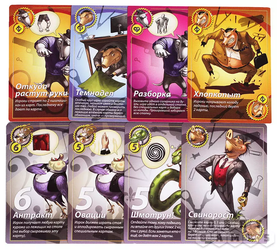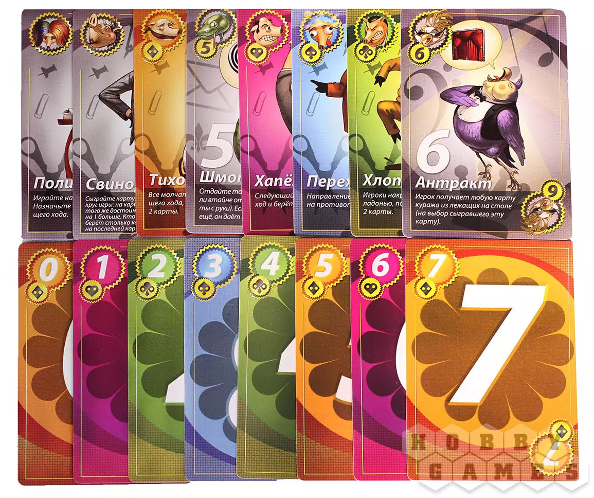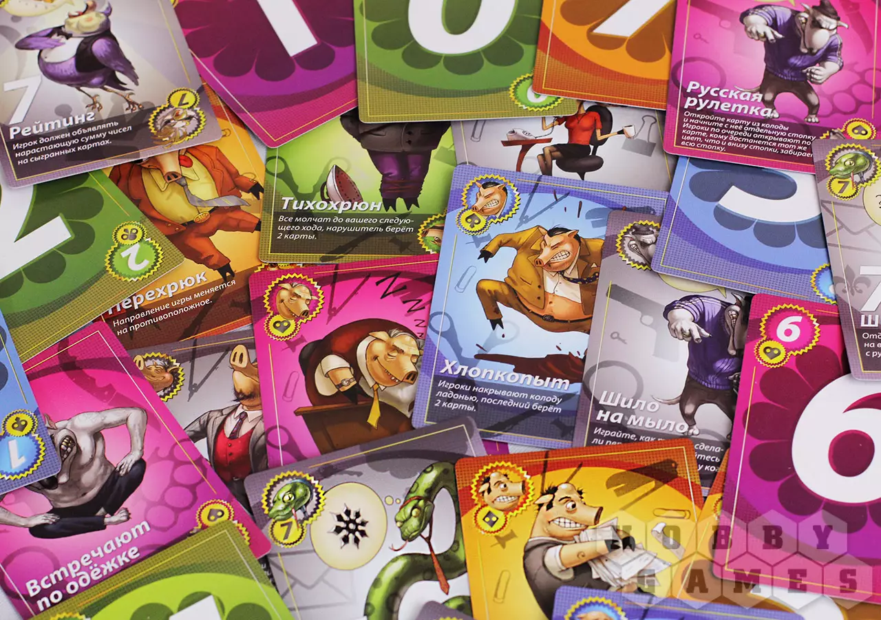 - «Тихохрюн» — заставляет всех игроков сидеть в тишине до вашего следующего хода. Нарушитель спокойствия должен будет взять 2 карты;
