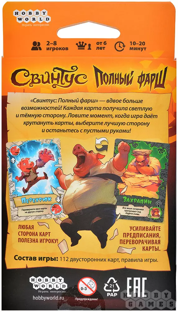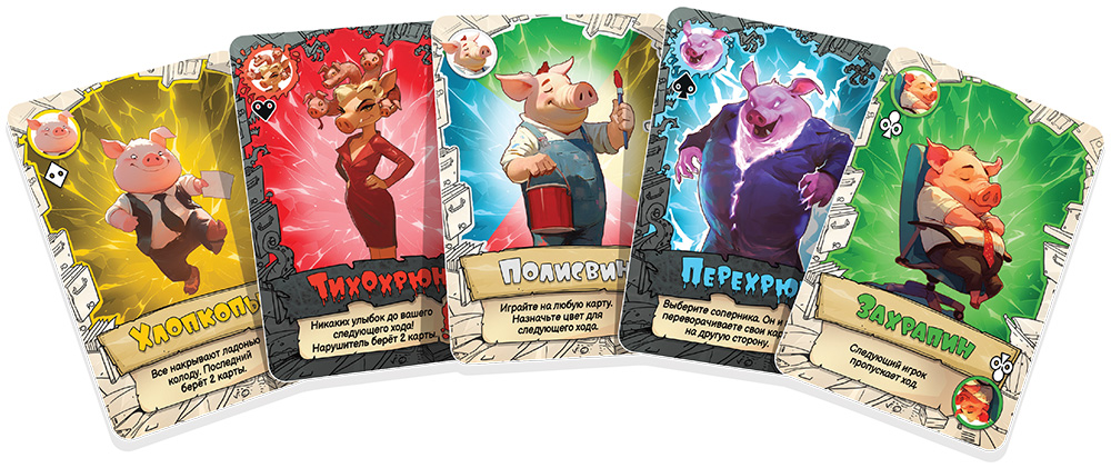 В мире свинов наступил настоящий переполох! Колода карт обрела двойную жизнь, и теперь каждый игрок в любой момент может перевернуть игру вместе с картами. То, что казалось верной победой, оборачивается весёлым разгромом, а коварные планы соперников рассыпаются благодаря ловкому движению вашей руки.