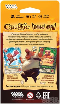 "Свинтус: Полный фарш" сохраняет дух оригинала, но добавляют крутой вираж: нужно быстрее всех избавиться от карт, используя их двойную природу. Ваша стратегия будет заключаться в том, чтобы чувствовать момент, когда переворот карты принесёт максимальный эффект и оставит соперников в растерянности.