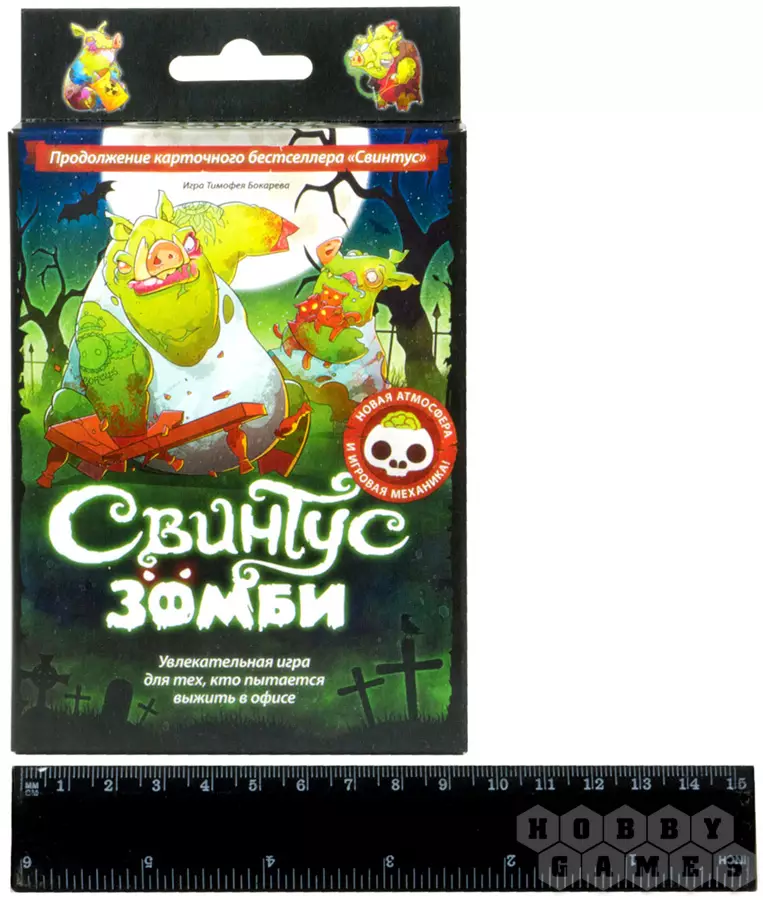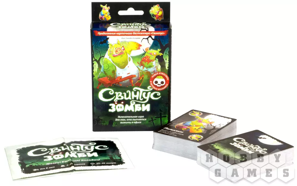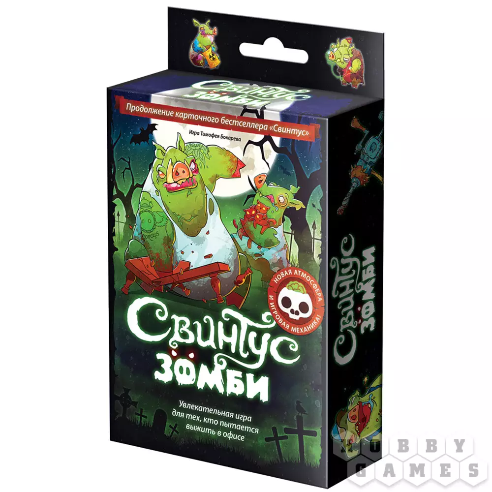 «Свинтус Зомби» – это очередная игра в мегапопулярной серии карточных игр «Свинтус» для тех, кто пытается выжить в офисе. Теперь избавиться от всех карт на руке стало ещё сложнее — и ещё интереснее! Заражайте соперников зомби-вирусами, ищите спасительные вакцины и станьте первым, кто дотянется до победы своим костлявым копытом!