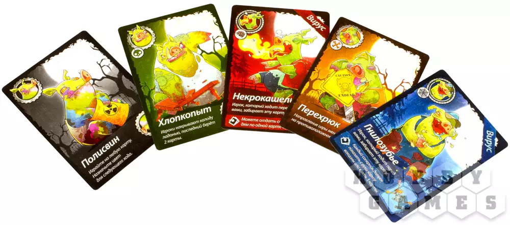 Нам по-прежнему нужно избавиться от всех своих карт посредством их розыгрыша на верхнюю карту стопки, это называется «подложить свинью». Помимо карт с номиналом, есть и специальные карты, которые превращают эту игру в концентрированное веселье, например, запрещают на целый раунд издавать любые звуки. Более подробный разбор правил смотрите во вкладке «Правила». В целом же игра напоминает «Уно», но гораздо интереснее и веселее.
