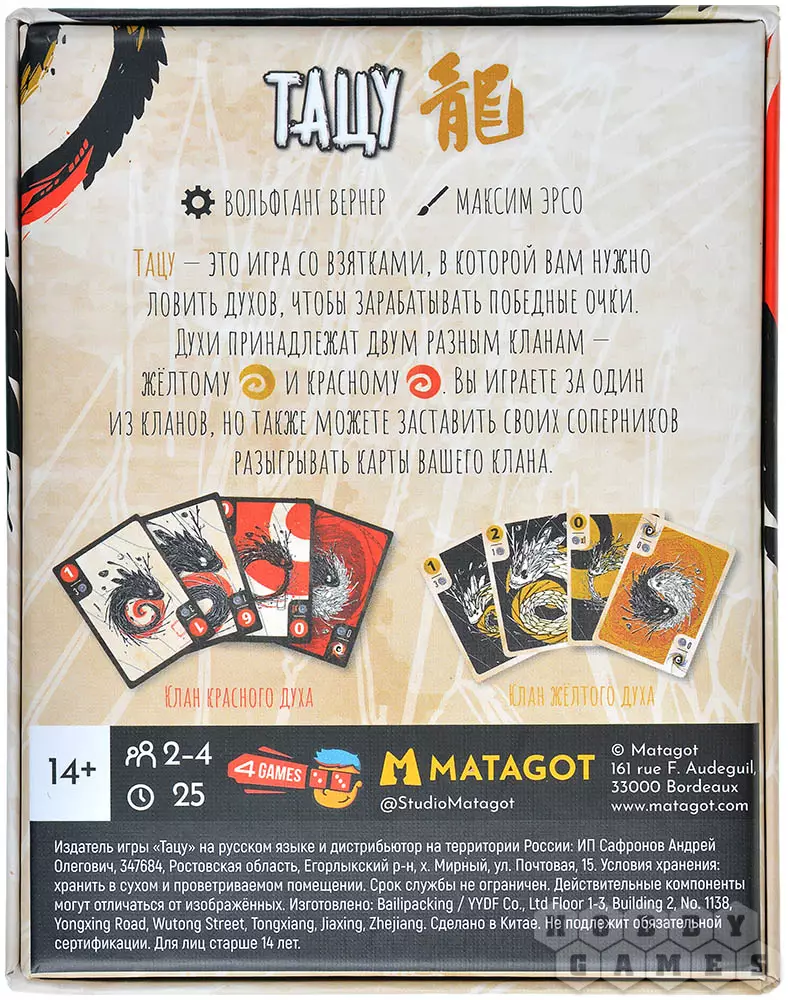"Тацу" – это карточная игра со взятками. Её цель – сделать так, чтобы ваша команда набрала 500 победных очков. Для этого вы будете разыгрывать карты духов, которые отличаются друг от друга по силе, и комбинировать их с картами слияния и множителя, чтобы ещё сильнее приблизиться к победе. Сможете ли вы принести своему клану славу, которую он заслуживает?