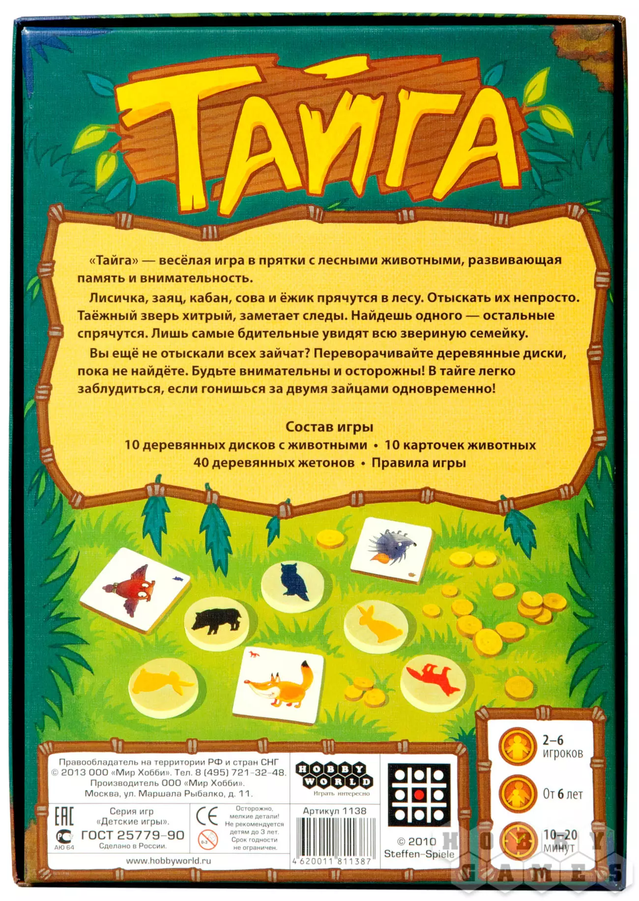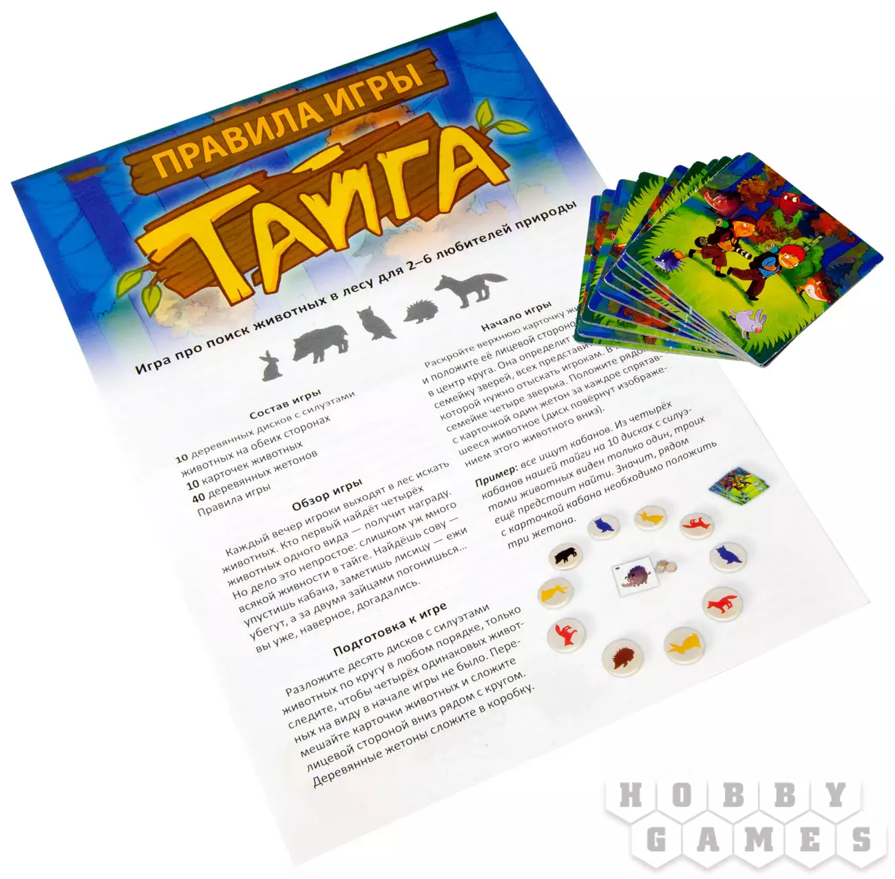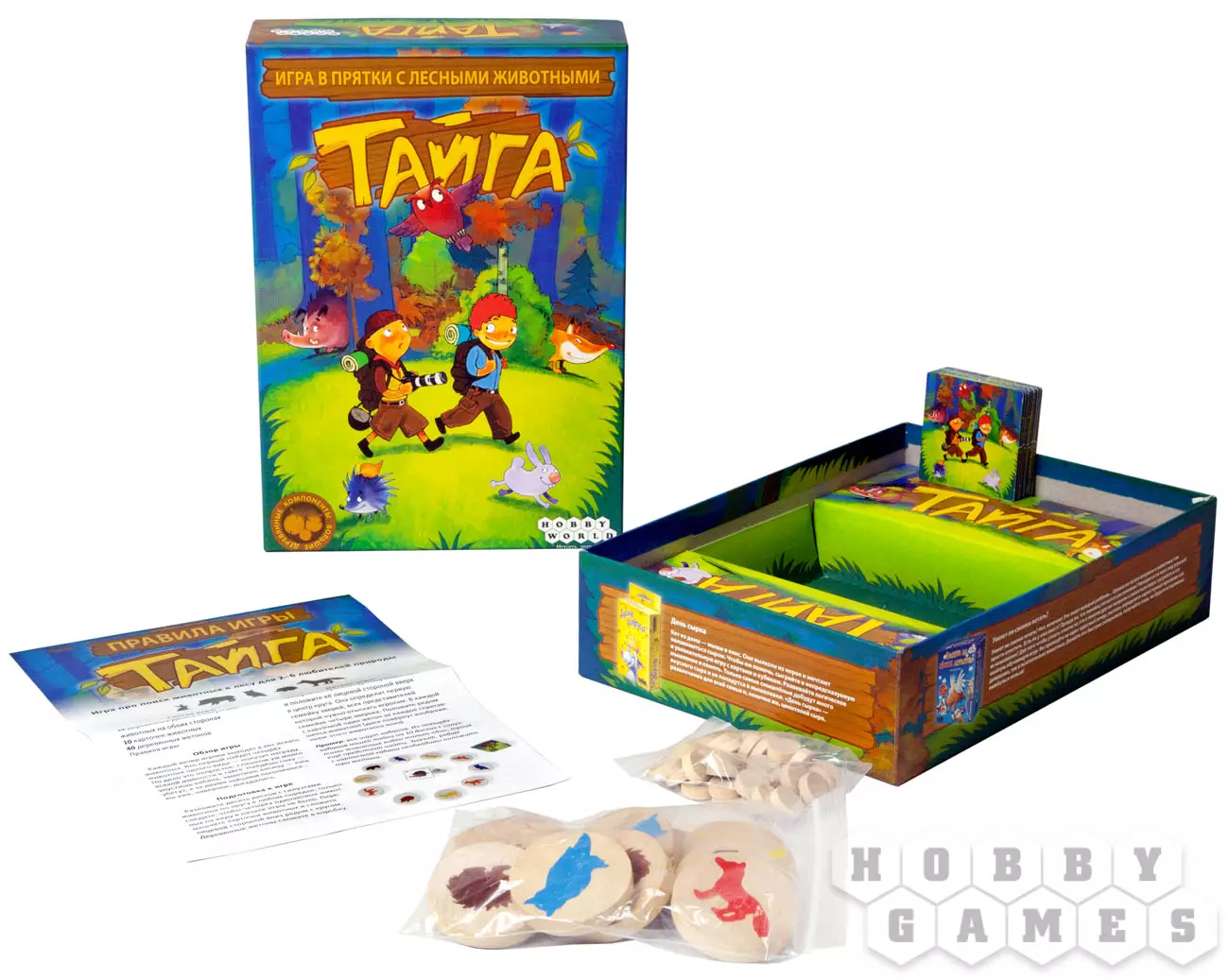 Марина09.06.2015 11:25Привлекла зеленая коробка со смешной картинкой бредущих туристов.Приятно удивили качеством крупные деревянные детали и зеленая атмосфера внутри. Игра очень понравилась.От увлекательного поиска зверей не могли оторваться!Но ощущение тайги на самом столе в игровом процессе не чувствуется,когда перебираешь белые карточки и белые деревянные диски.Зеленого на игровом поле ничего нет,кроме отложенной приятно оформленной коробки,не участвующей в игре.А ведь все-таки зверей в тайге ищем! Оформление можно было сделать лучше :вместо маленьких кругляков подошли бы фигурки елочек,а квадратные картонные тайлы можно было бы изобразить в виде бревнышек или пеньков.Сделать игру красочней это возможно!Пришлось взять из другой игры елки,зеленое поле и создать атмосферу леса.Вот тогда игра пошла на ура! Но даже при данном оформлении игра забавная, веселая,легкая.Советуем поискать зверей и детям и взрослым.Придумано хорошо ,но не совсем доведено до совершенства.А в целом ,производитель молодец!-