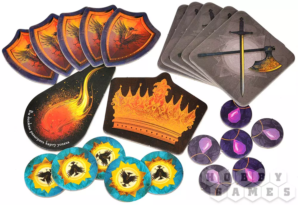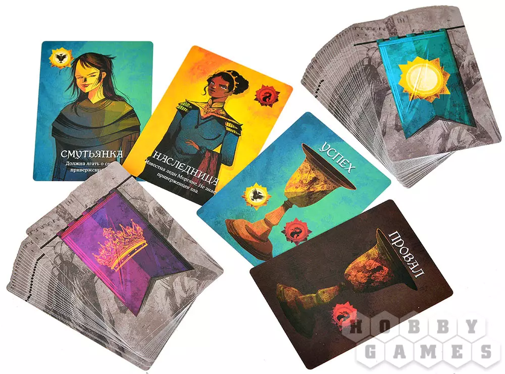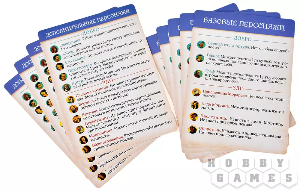 Наконец, завершающая фаза раунда – фаза передачи лидерства. Старый предводитель выбирает нового. Лидером не может стать тот, кто уже им был. В игре на шесть и более игроков также передаются амулеты, позволяющие проверять верность участников.